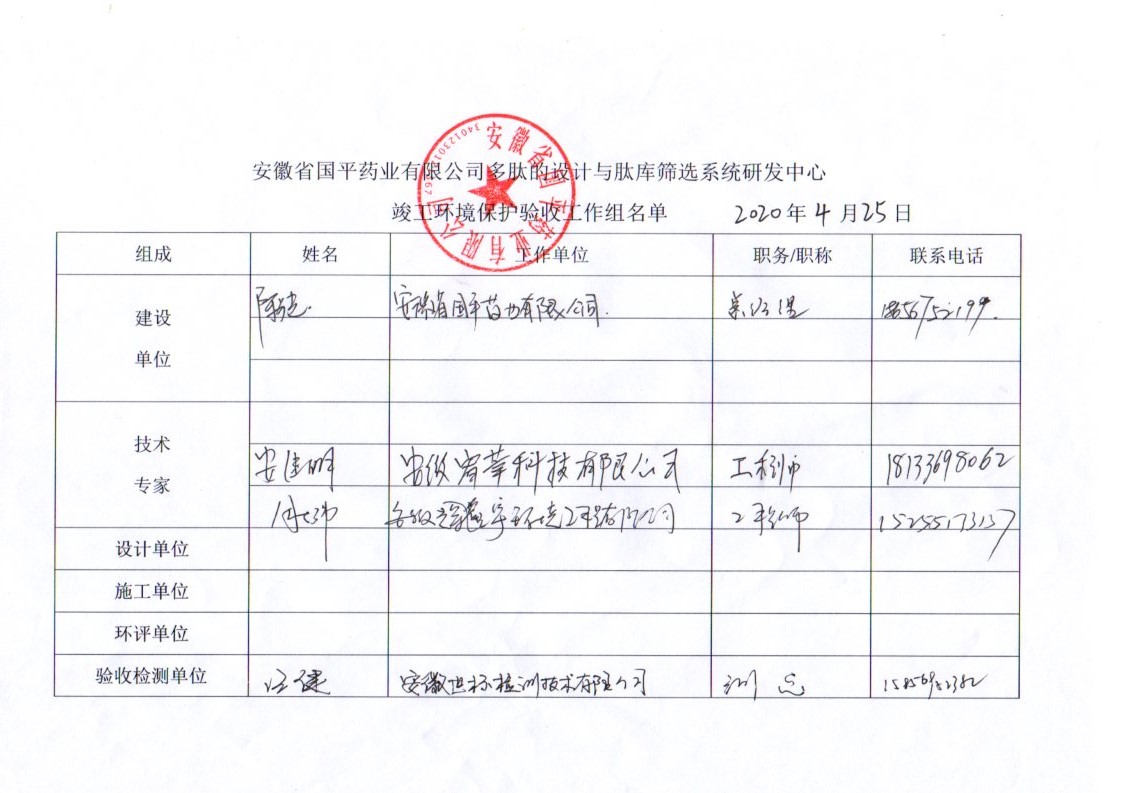 安徽省國平藥業有限公司多肽的設計與肽庫篩選系統研發中心竣工環境保護驗收報告公示